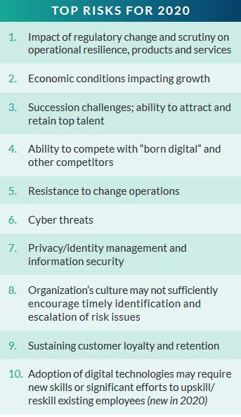 Corporate executives are contending with so many potential risks that, depending on fast-changing economic and market developments, some have to take priority over others. Among those bubbling to the top in Executive Perspectives on Top Risks for 2020, a report from consulting firm Protiviti and North Carolina State University's Enterprise Risk Management Initiative, are: the impact of regulatory change on business; economic conditions that may restrict business growth; and the challenge of recruiting and retaining talent in an environment where business models and processes are being disrupted by technological innovation.