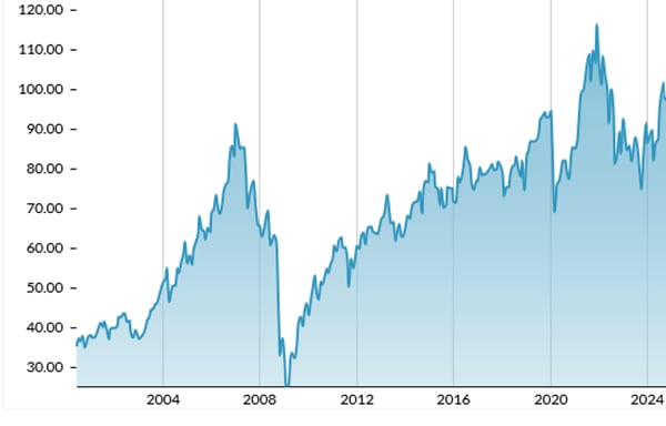 The top panel in Figure 2 (below) shows U.S. house price index for the past three decades. This graph represents real asset transactions for regular (and thus illiquid) real estate values. The bottom panel of Figure 2 shows the performance of iShares U.S. Real Estate ETF (which represents exchange-traded instruments) across the past 20 years. The former have a much smoother performance than the latter, which is highly volatile.