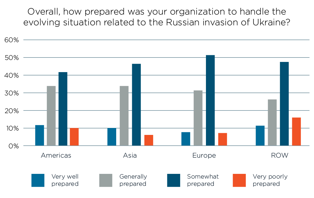 Respondents indicated that firms were generally not very well prepared for the evolving situation related to the Russian invasion of Ukraine. Most respondents revealed that, while their firms had considered the possible conflict, they were not expecting the situation to evolve as it has. Respondents from European firms indicated an overall lower level of preparedness than respondents from either Asia or the Americas. A general lack of preparedness was also reported amongst firms with moderate to significant exposure to Russia and Ukraine.