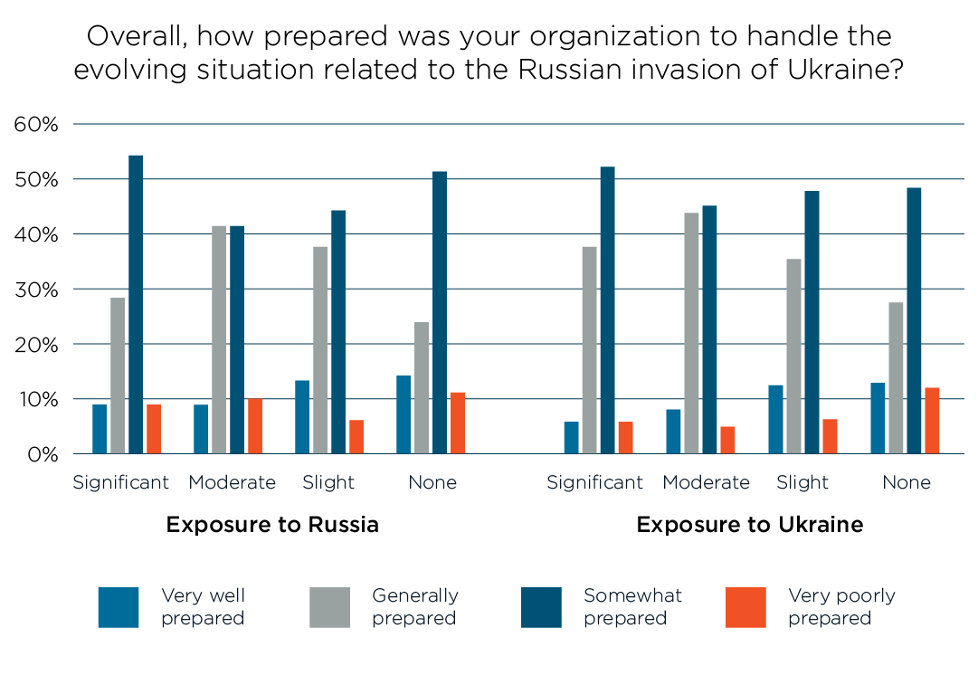 The survey specifically captured the perspective from risk managers at firms that have a range of direct and indirect exposure to Russia and Ukraine. Roughly 25% reported that their firm has significant or moderate direct and indirect exposure to Russia and had existing operations in Russia prior to the invasion, while roughly 15% reported that their firm has significant or moderate direct and indirect exposure to Ukraine and had existing operations in Ukraine prior to the invasion. Many of these firms had exposure to both Russia and Ukraine.