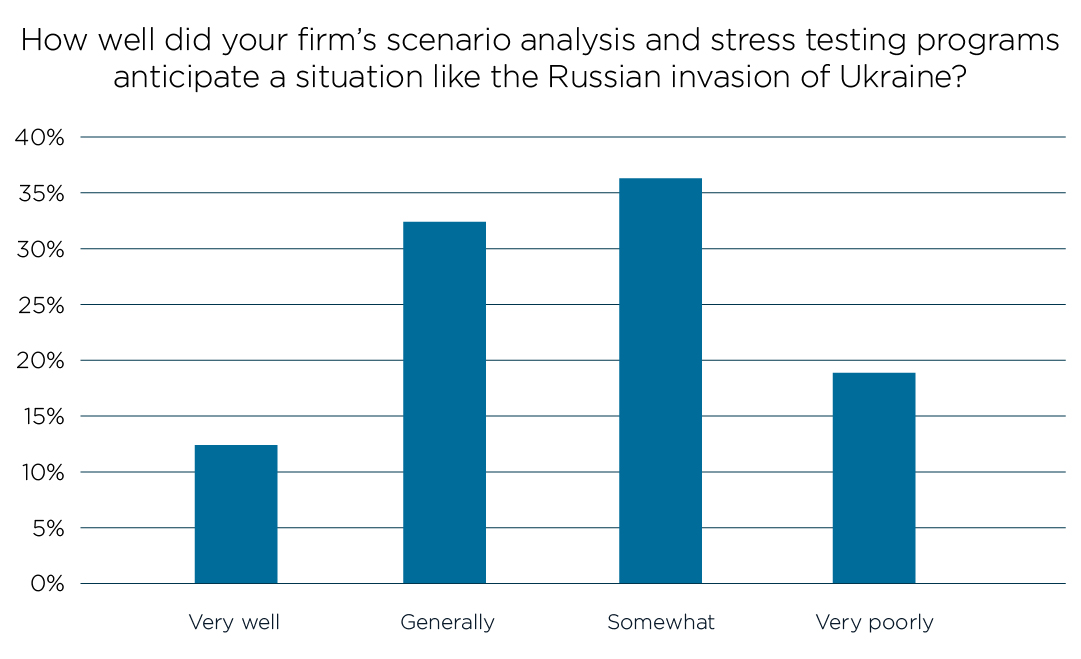 It’s not surprising that few firms appear to have been very well prepared for the conflict, given that most respondents indicated that their firm’s scenario and stress testing analysis only “somewhat” or “very poorly” anticipated a situation like the Russian invasion of Ukraine.
