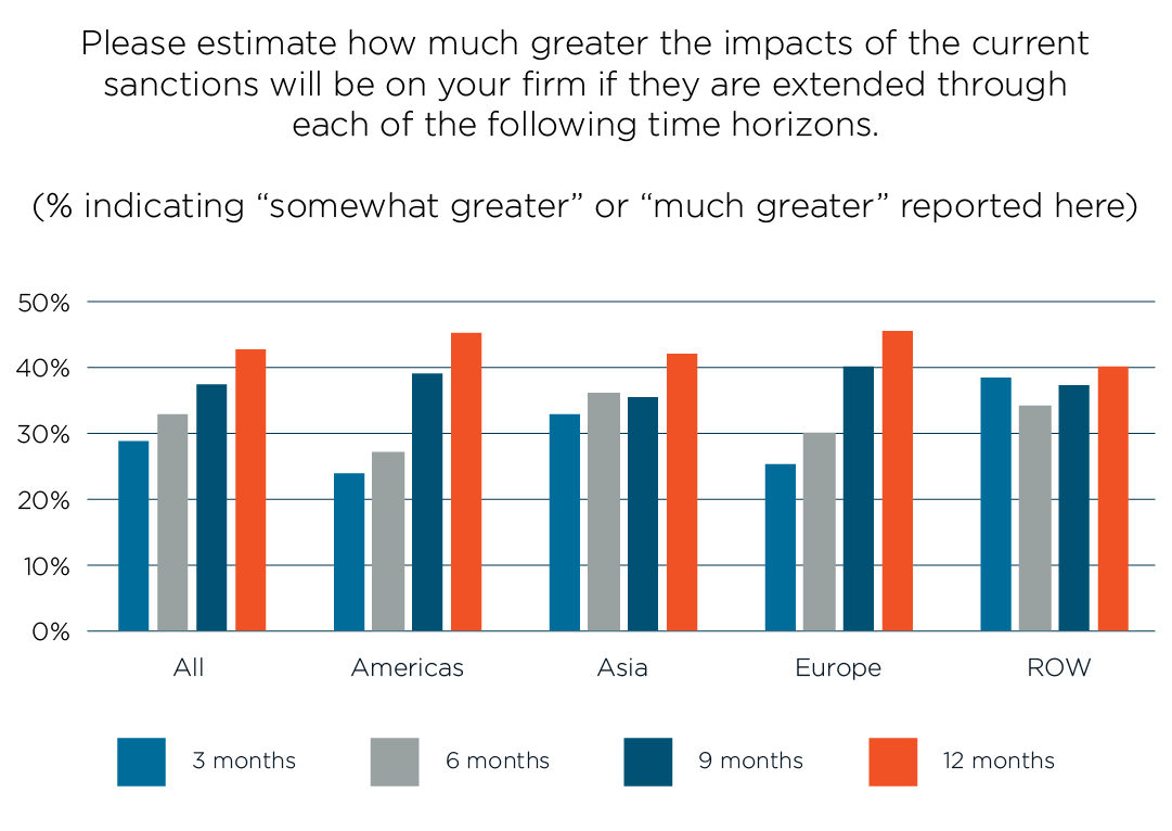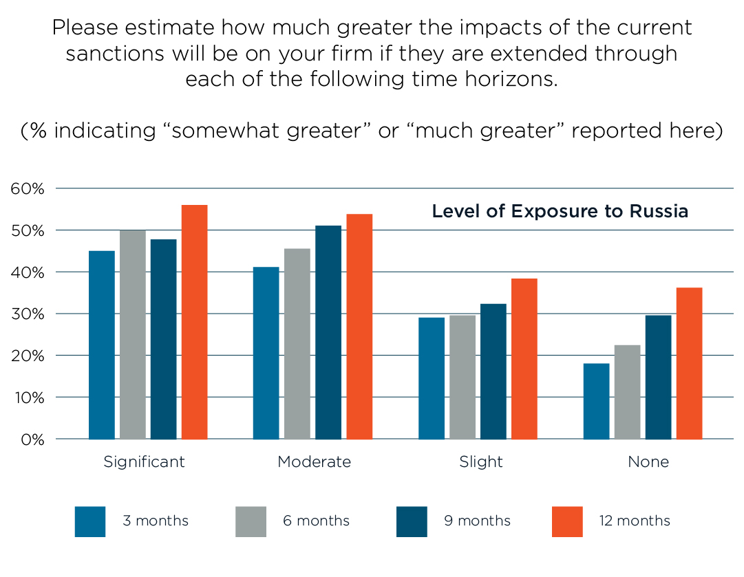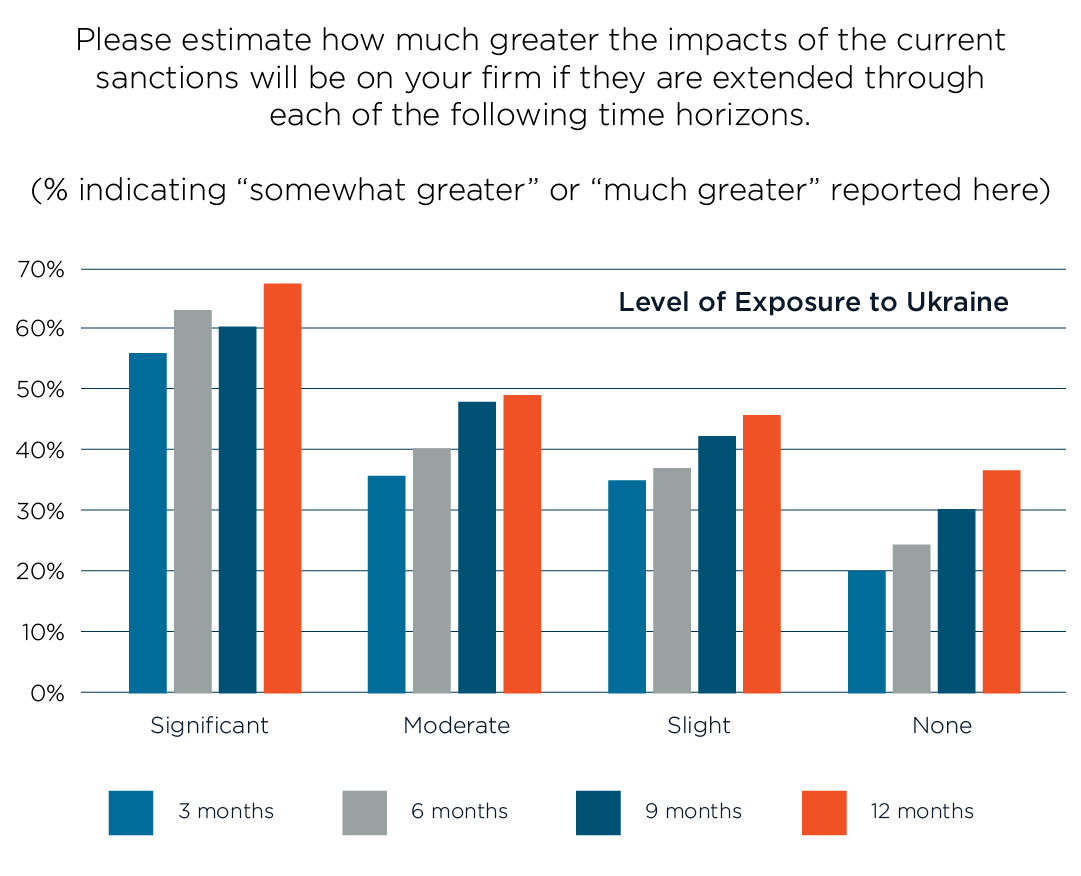 Respondents indicated that the impacts of current sanctions would increase meaningfully with time, as over 40% said that the impacts would be “somewhat greater” or “much greater” if the sanctions were extended for 12 months. Concerns about the impact of longer-term extensions of the current sanctions’ regime appeared meaningfully higher for firms with significant exposure to Russia or Ukraine.