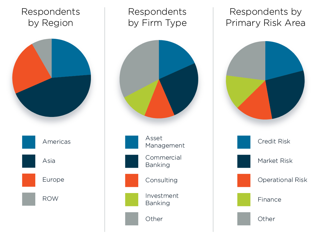 Over 850 FRMs participated in this survey representing a broad swath of risk managers across the globe, financial services firms and risk disciplines, as shown in the respondent breakdowns by region, firm type, and primary risk area in the charts below.